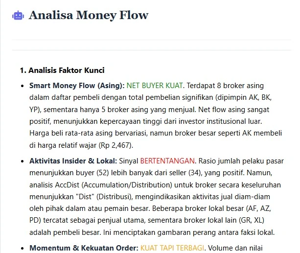 - Smart Money Flow (Asing): NET BUYER KUAT. Terdapat 8 broker asing dalam daftar pembeli dengan total pembelian signifikan (dipimpin AK, BK, YP), sementara hanya 5 broker asing yang menjual. Net flow asing sangat positif dan mencerminkan kepercayaan tinggi investor institusional luar. Broker besar seperti AK membeli di harga relatif wajar (Rp 2.467).